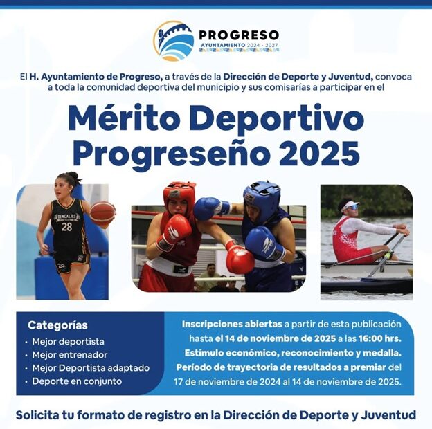 El Ayuntamiento de Progreso, encabezado por el alcalde Erik Rihani González, a través de la Dirección de Deporte y Juventud, recuerda a las y los interesados en participar en el “Mérito Deportivo Progreseño 2025” que las inscripciones cerrarán el próximo viernes 14 de noviembre, en un horario de 9:00 a 18:00 horas, en las oficinas de la Dirección de Deporte.